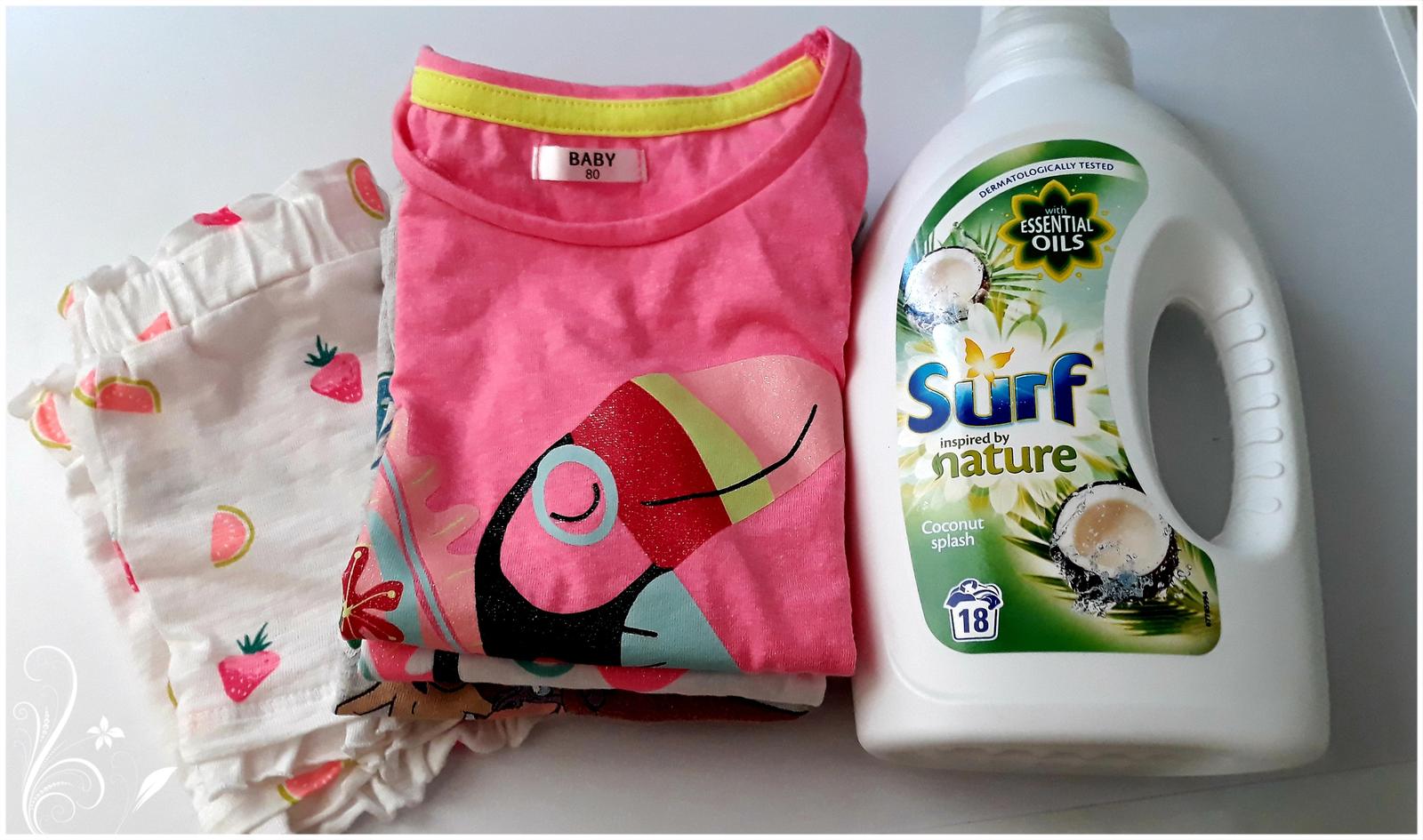 Ako prvý som vyskúšala Coconut Splash. Nepoužila som aviváž, aby som zistila, ako bude prádlo voňať a ako dlho. Vôňa je príjemná a bola som zvedavá, ako bude voňať po vysušení 🥥 Dala som oprať detské veci. Neboli nejako špinavé. Len z bežného nosenia po vonku a doma. V ten deň sa Tomáško vyšantil v piesku a mal ho až v slipkoch, tak šiel rovno do vane a slipky s ponožkami do práčky. Prala som na 40' 1h a 36min programe.