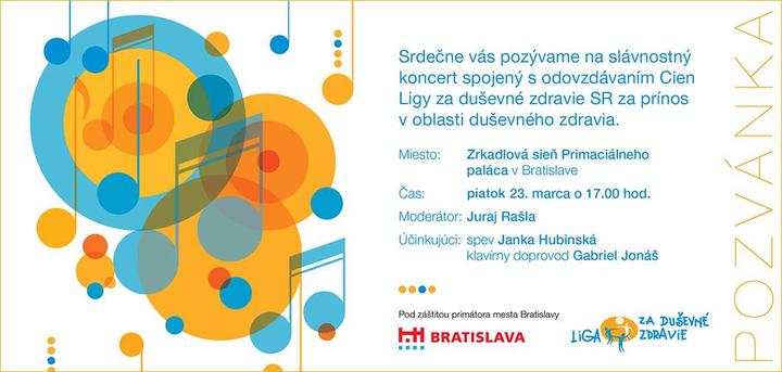 dovoľte, aby som Vás srdečne pozvala na tohtoročný Slávnostný koncert Ligy za duševné zdravie SR, ktorý sa uskutoční dňa 23.3. o 17:00.