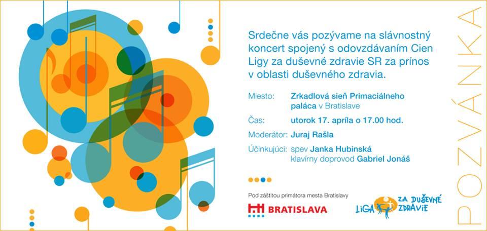Milí priatelia, zajtra sa uskutoční Slávnostný koncert Ligy za duševné zdravie SR. Vystúpi na ňom šansónová diva Janka Hubinská, moderovať bude herec Juraj Rašla a cenu príde odovzdať aj emeritný biskup Robert Bezák.