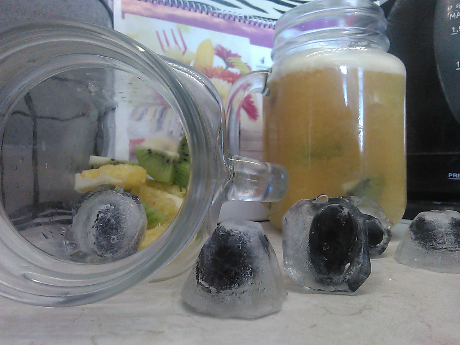 Odstavujeme: 1 banan, 6 pomarančov, 6 broskýň, 1 stredný ananás, 2 jablka. Nechala som aj dren, kto to nelubi,tak odstedit. Do ladovnika som si dala po hrozne,zaliala vodou,spravila ľad. Na kocky nakrajala kiwi a pomaranč. Na celú dávku pridať 3dcl vody,alebo minerálky.