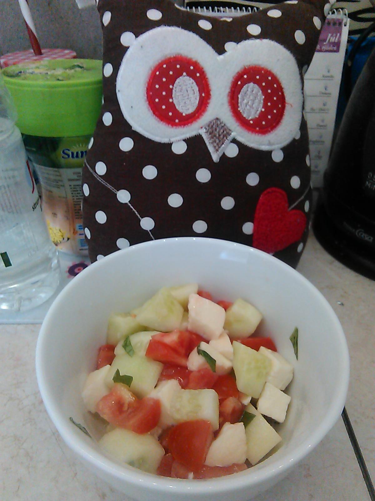 Paradajka, uhorka, mozarela a na drobno nakrajana bazalka. Pokvapkane olivovým olejom. Zamiesane 😊