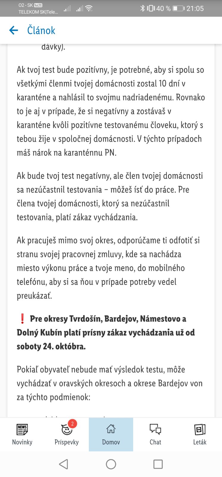 @toso2007 mne sa nepáči ,ked ma niekto vydiera a núti..šla by som aj 10x,ak by to nebolo takto podané ☹ ak to inak nepojde,tak prvé kolo vynechám,budem od 1.11. doma -teda 2.3.4.5. 10 .2020 a hned v piatok ráno sa dám v druhom kole nasilu otestovať,aby som mohla aspon na poštu a do práce...som zdravá ako ryba nádchu som mala naposledy pred rokom a odvtedy nič..dokopy nikam nechodím,tak ma to fakt štve,že mám ísť na test,ktorý u mna nič nenájde aj keby som náhodou bola pozitívna,kedže ten test reaguje len na ľudí s príznakmi...no proste nie som s tým stotožnená a štve ma takýto nátlak a vydieranie zo strany štátu ☹