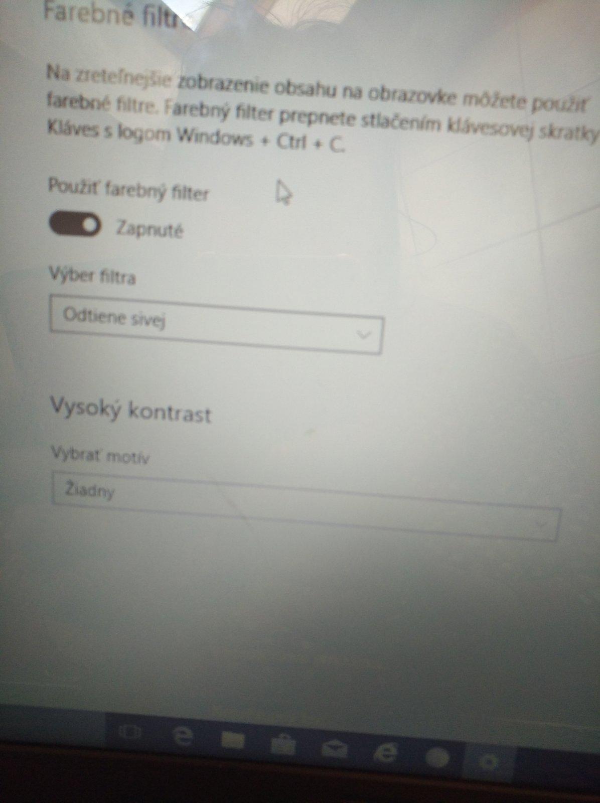 Vo vsetkych nastaveniach ,potom prisposobenie-pozadie ,obrazovka,na pravej strane su suvisiace nastavenia,pod tym klikni na nastavenie vysokeho kontrastu,farba a kontrast,a tam je pouzit farebny filter,ak je to zap,tak je cierno biele.Tak to vypni.