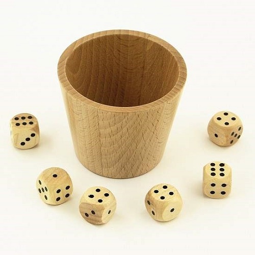 6 klasických bodkovaných hracích kociek veľkosti 16 mm v bukovej dóze bez veka.