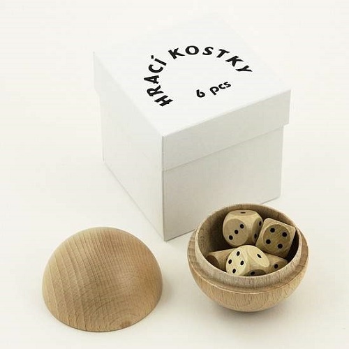Hracie kocky veľkosti 16 mm s bodkami 1-6 uložené v drevenej bukovej guli, delené na 1/2. Guľa je vložená v papierovej škatuľke s vekom 75 x 75 x 75 mm