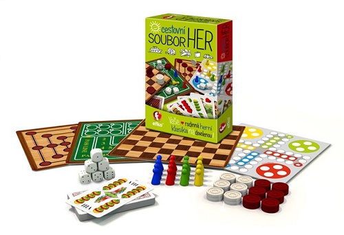 Cestovný súbor hier obsahuje: Človeče, nehnevaj sa, Dámu, Mlyn, Craps - napínavú casino hru s jednoduchými pravidlami, Kocky, Mariášové karty a vojde sa do každého batôžka alebo tašky
