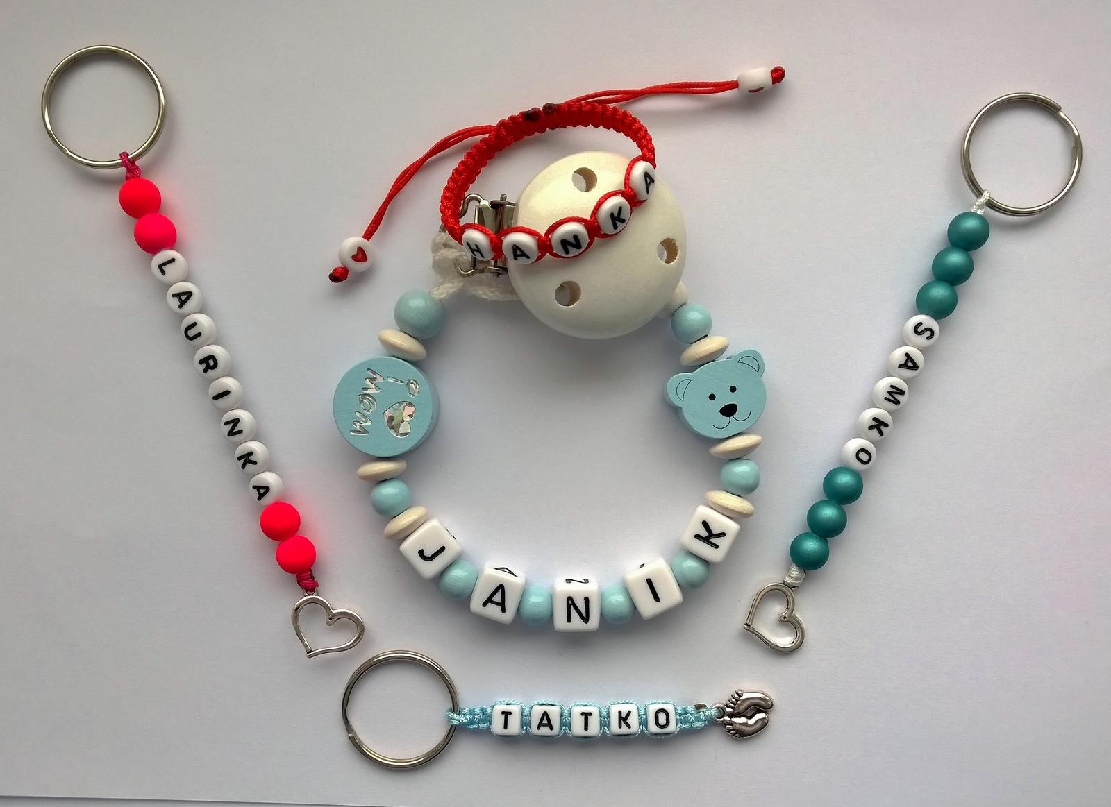 Kľúčenka - 2,50 €, náramok - 2,50 €, retiazka na cumlík - 8,50 €