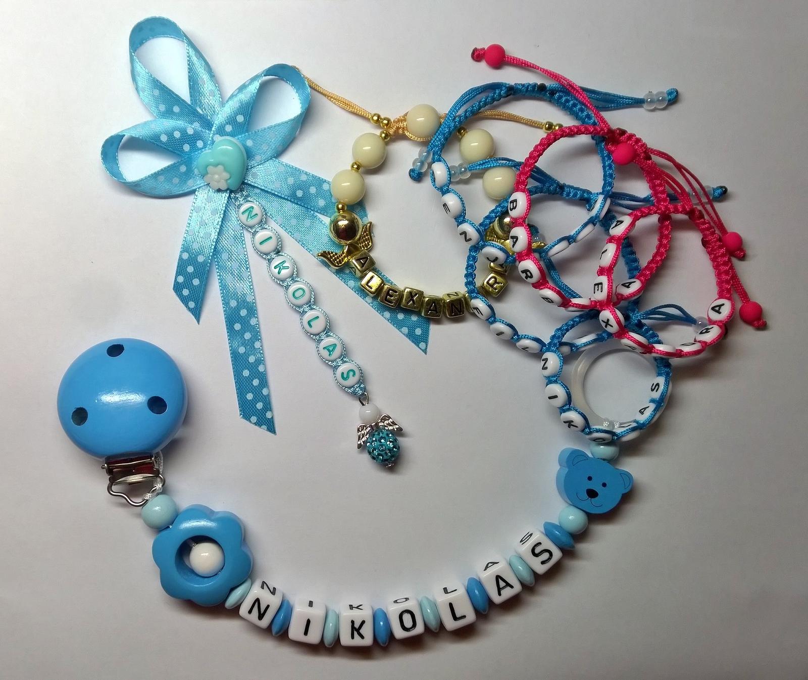 Retiazka na cumlík - 8,50 €, korálkový náramok s menom - 3 €, pletený náramok s menom - 2,50 €, mašlička - 2,50 €