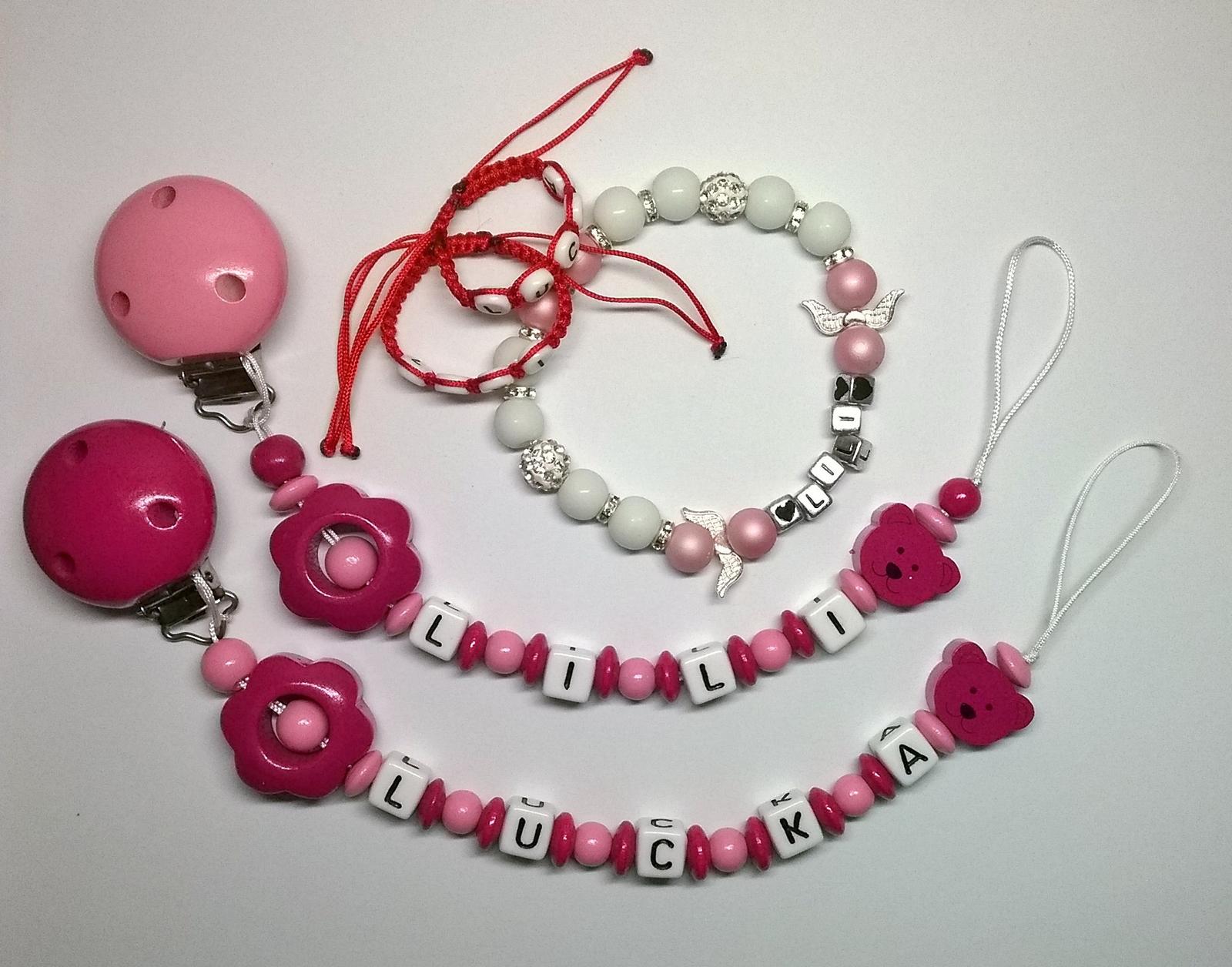 Pletený náramok - kus 2,50 €, korálkový náramok - 3 €, retiazka na cumlík - kus 7,50 €