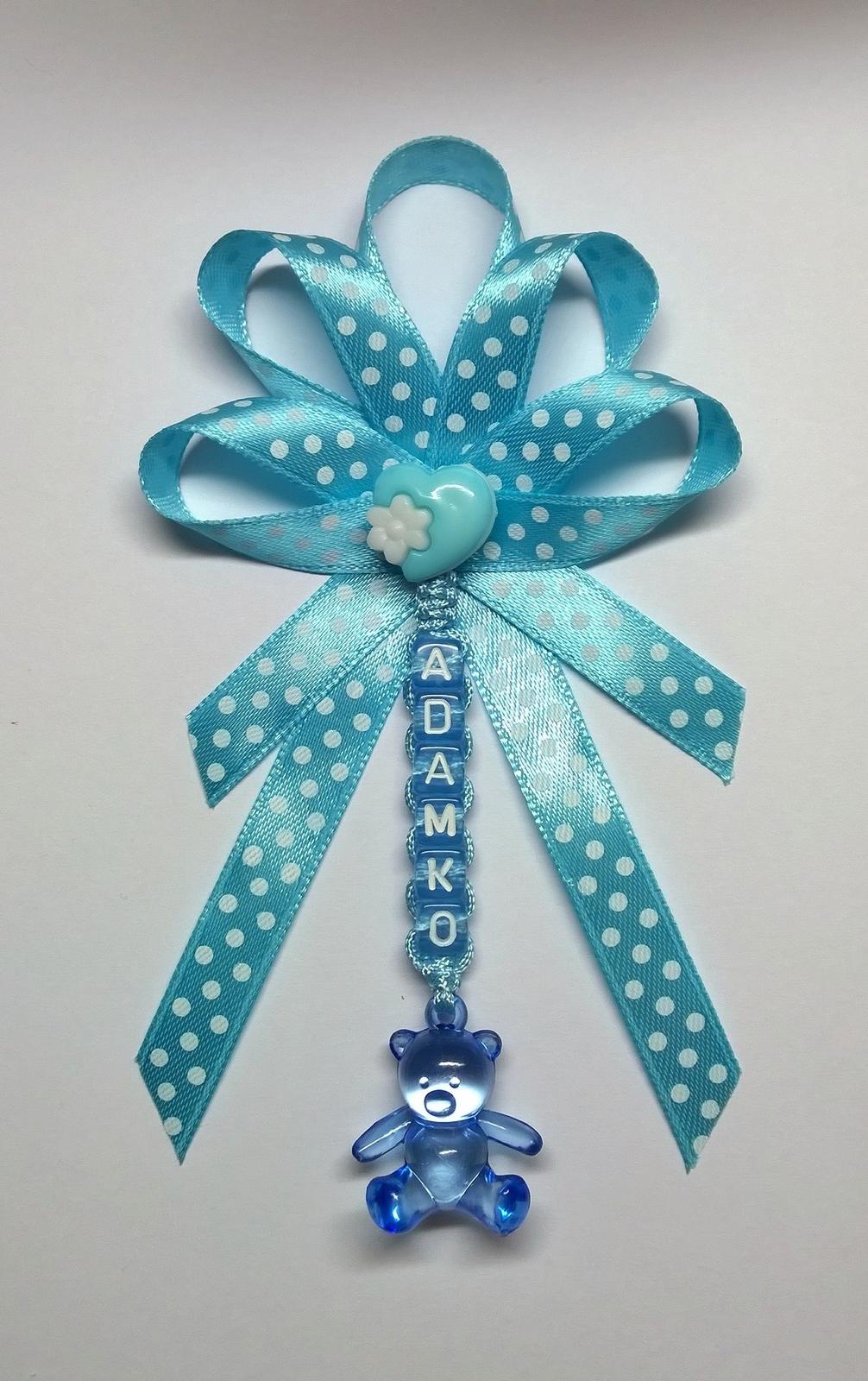 dobry 🙂 dala by sa urobit takáto mašlička, len s bielo čiernymi kockami, prívesok tie dve nožičky a keby bola ta stužka v tmavšej modrej...keby nie tak moze byt aj tato farba a meno Jakub 🙂 dakujeeem