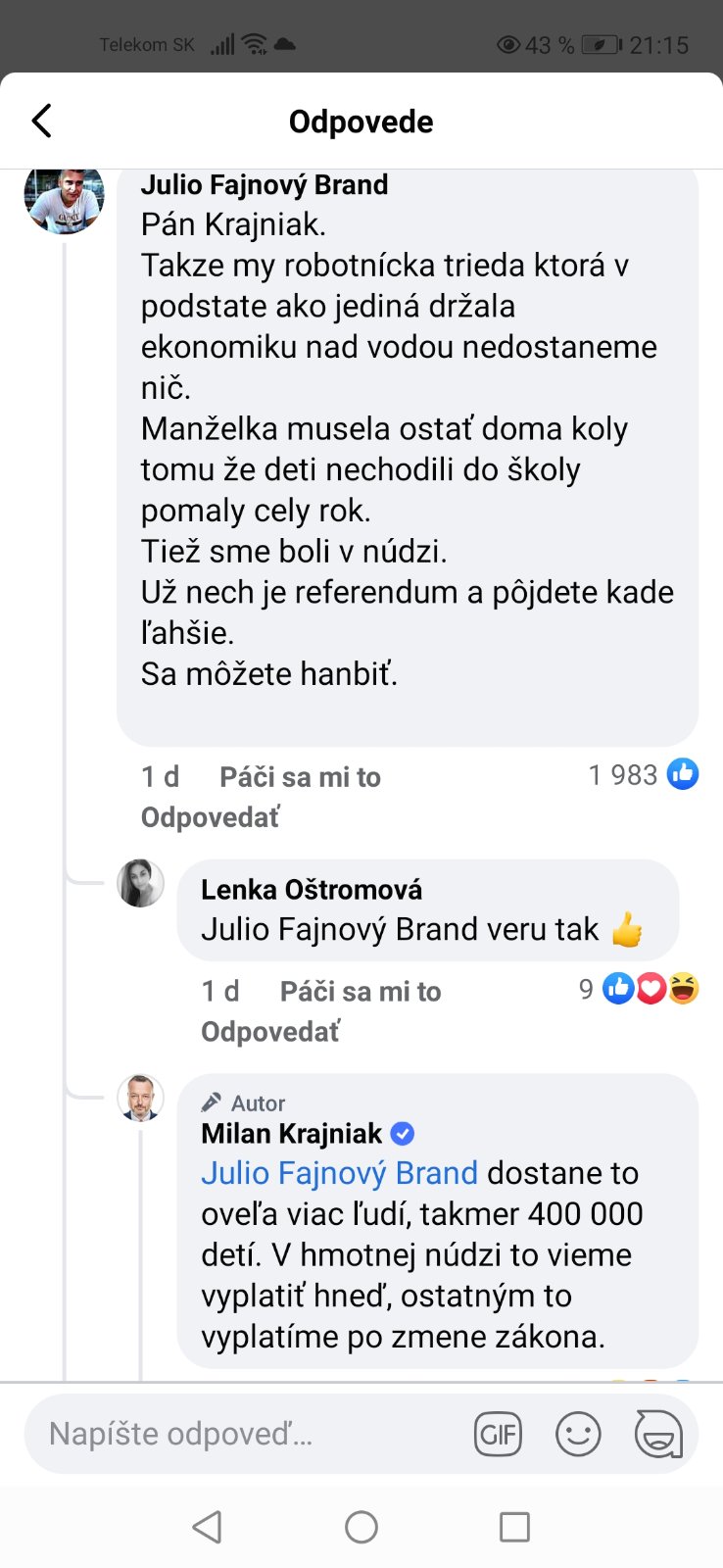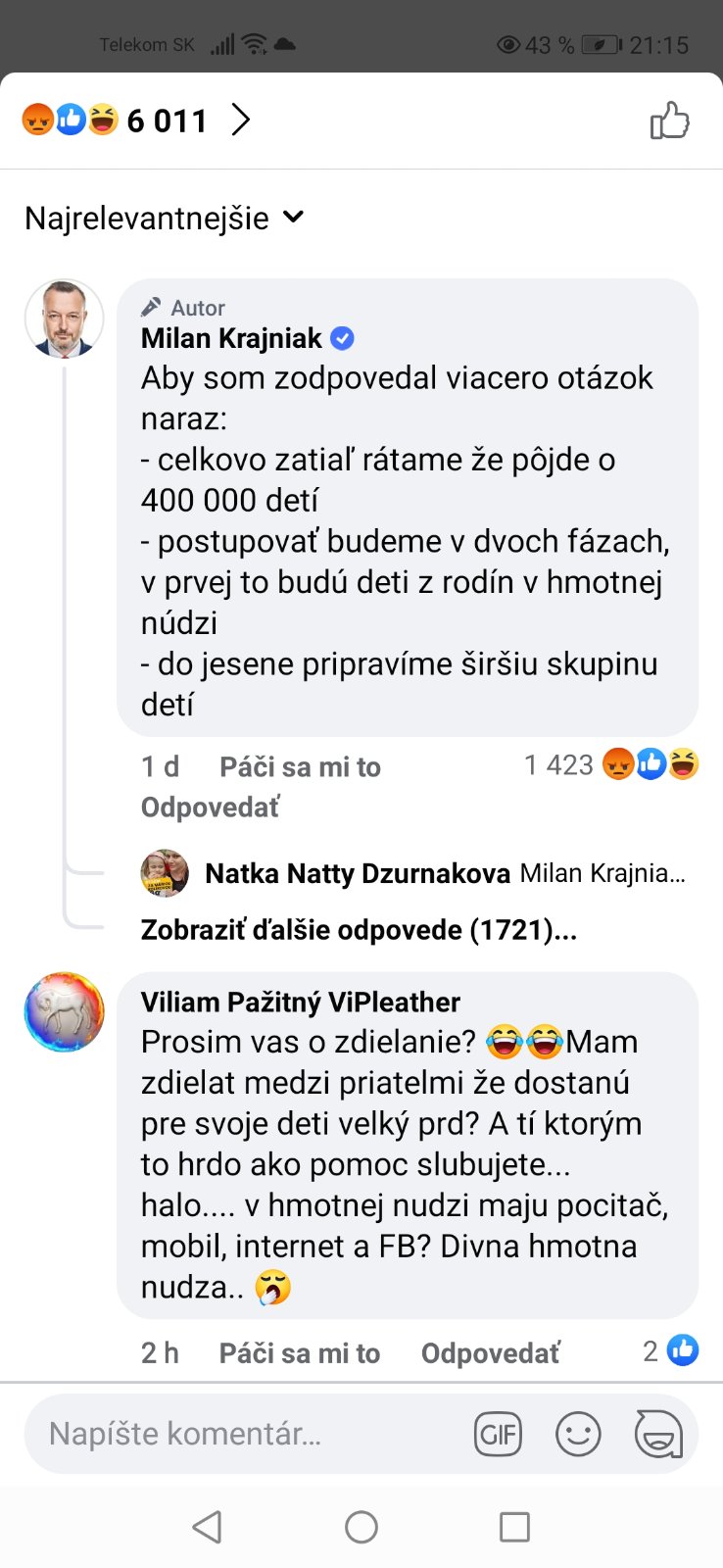 Ja som sa doslova uštvala od marca minuleho roka...Doma 4 deti, 2 na notebookoch, 2 na mobiloch, elektrina, obedy každý deň, ja na homeofice, počas normálnej práce na pc ešte aj ponožková brigáda, kde mi deti pomáhali aby sme si privyrobili...varila,upratovala som po nociach,a teraz dostanem takúto ,,facku"...tak sockam sme sa poskladali na kompenzácie (ani neviem čoho) a naše deti nepotrebujú....Toto je proti zdravému rozumu....Vidly,lopaty do rúk a smer parlament! Si z nás srandu robia....