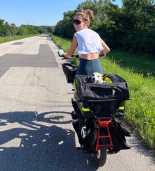 Skvelé je zrkadielko na sledovanie situácie za mnou a aj psíka v boxe. Postranné tašky sú vhodné aj na dlhšie cestovanie. V predu je plošina na ďalšiu obrovskú tašku, ktora je odnímateľná, čo je skvelé na nakupovanie - nákup si rovno hádžem do tašky.