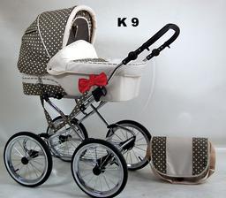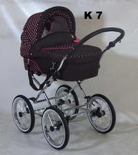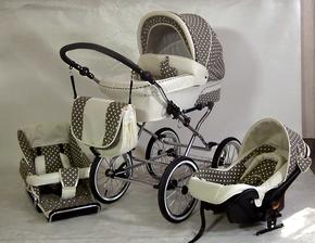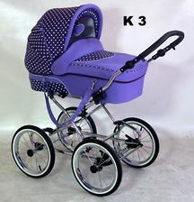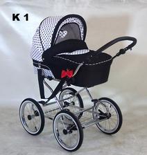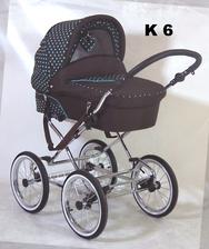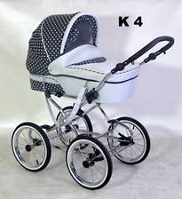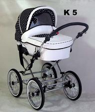 Elegantný, praktický, spoľahlivý, módny, pohodlný, hojdavý retro-kočík s veľkými nafukovacími dvojfarebnými kolesami na ložiskách, s vaničkou o rozmeroch 78x38 cm a pochrómovanou konštrukciou s možnosťou dokúpenia športovej časti. Na konštrukciu je tiež možné pripnúť autosedačku - vajíčko.