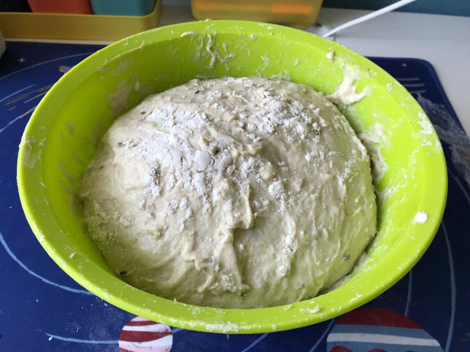 Pridáme 2 čl soli, 2 čl mletej rasce, 90 gr. uvareného, ošúpaného a nastrúhaného zemiaku, ľanové semienka a poriadne miesime. Zakryjeme fóliou, utierkou a necháme 30 minút kysnúť na teplom mieste.