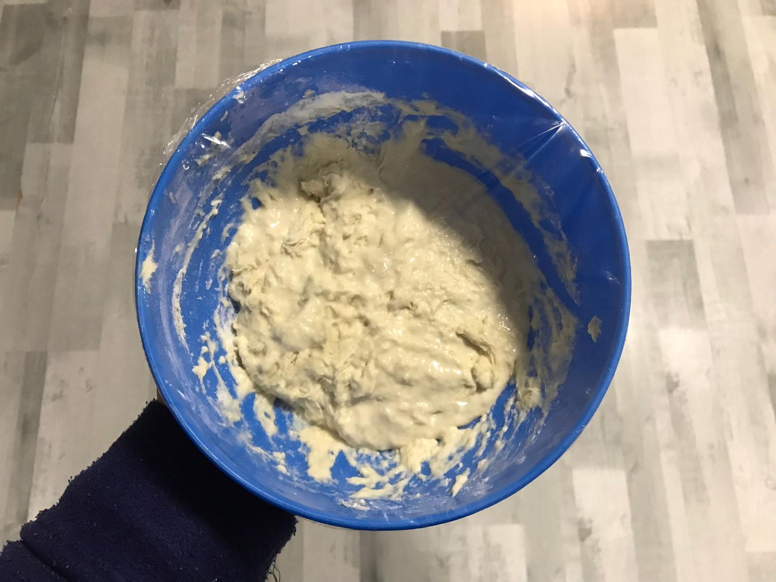 Najprv si rozmiešame droždie vo vode a potom túto zmes pridáme do múky. Zakrytú misku zakryjeme potravinárskou fóliou a utierkou. Necháme odpočívať 10-12 hodín.