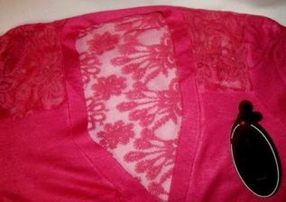 nadherny damsky svetrík -cardigan ,farba sú žiarivé ,sýte,na zadnom diely je čipka ,je kvietkova ako v detailnej foto , veľkosť je také S/M , dovoy Taliansko , cena 13,50€