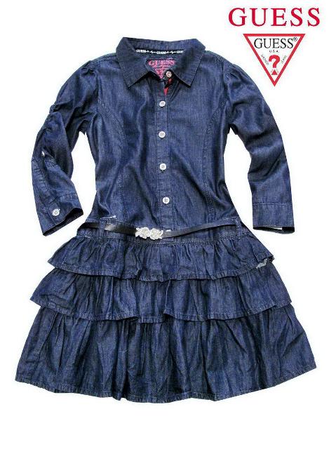 Štýlové dievčenské jeansové šaty z dielne značky GUESS, modrej farby, s dlhým rukávom s možnosťou vypnutia na 3/4 dĺžku rukávov. Zapínanie na gombíky s logom značky. Sukňová časť je bohato zdobená volánikmi. Súčasťou šiat je odnímateľný opasok.