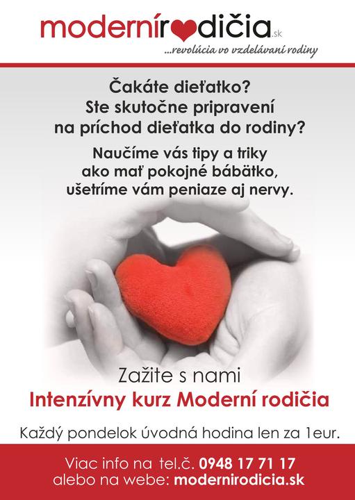 Moderní rodičia - čakáte bábätko a nie ste si istí či ste na to ako rodina pripravení? Ste typ maminky, čo má rada veci pod kontrolou a neuspokojíte sa s vetou "dáko bolo, dáko bude?" Robte veci lepšie, zjednodušte si život na Materskej dovolenke a vychutnajte si čas s vaším dieťatkom. Prídete na Intenzívny zážitkový kurz pre Moderných rodičov do Košíc!!