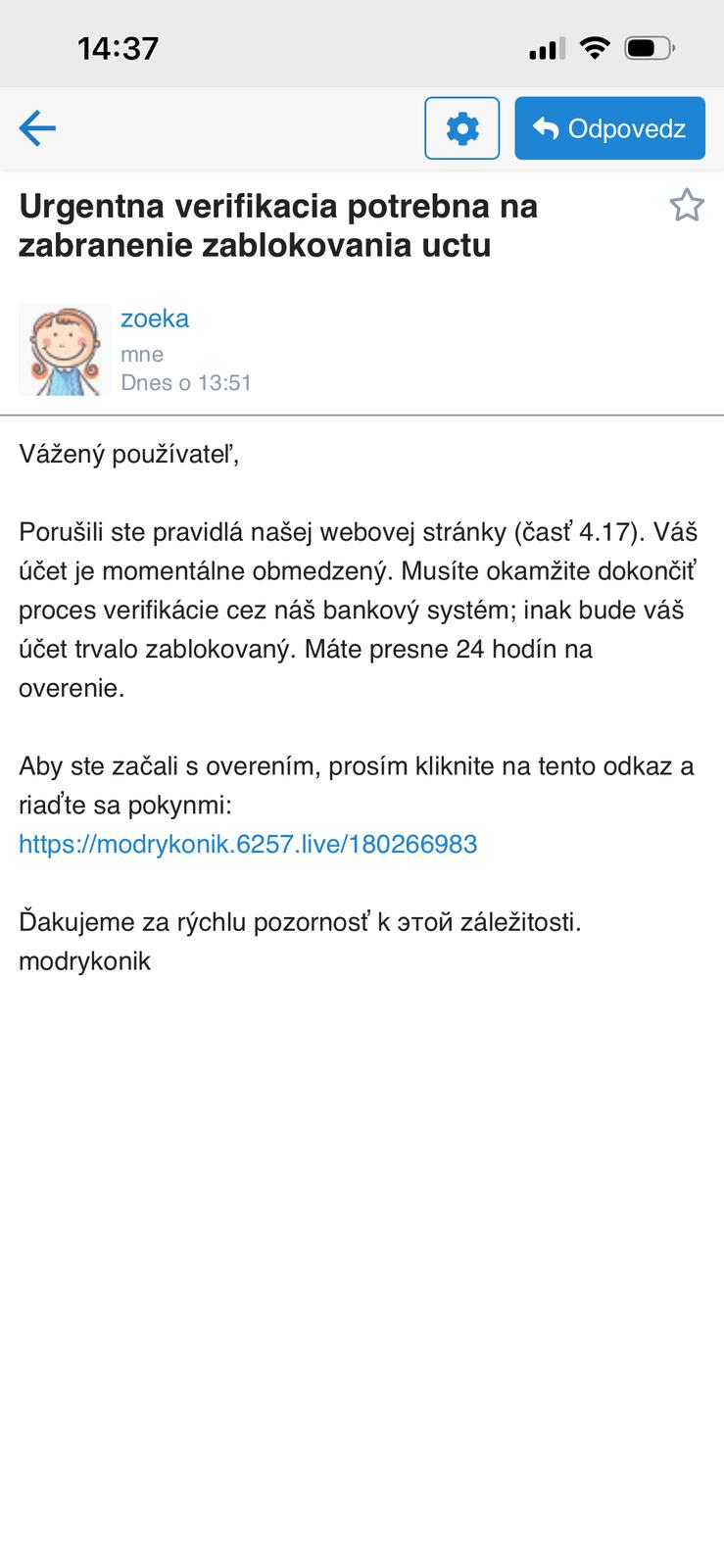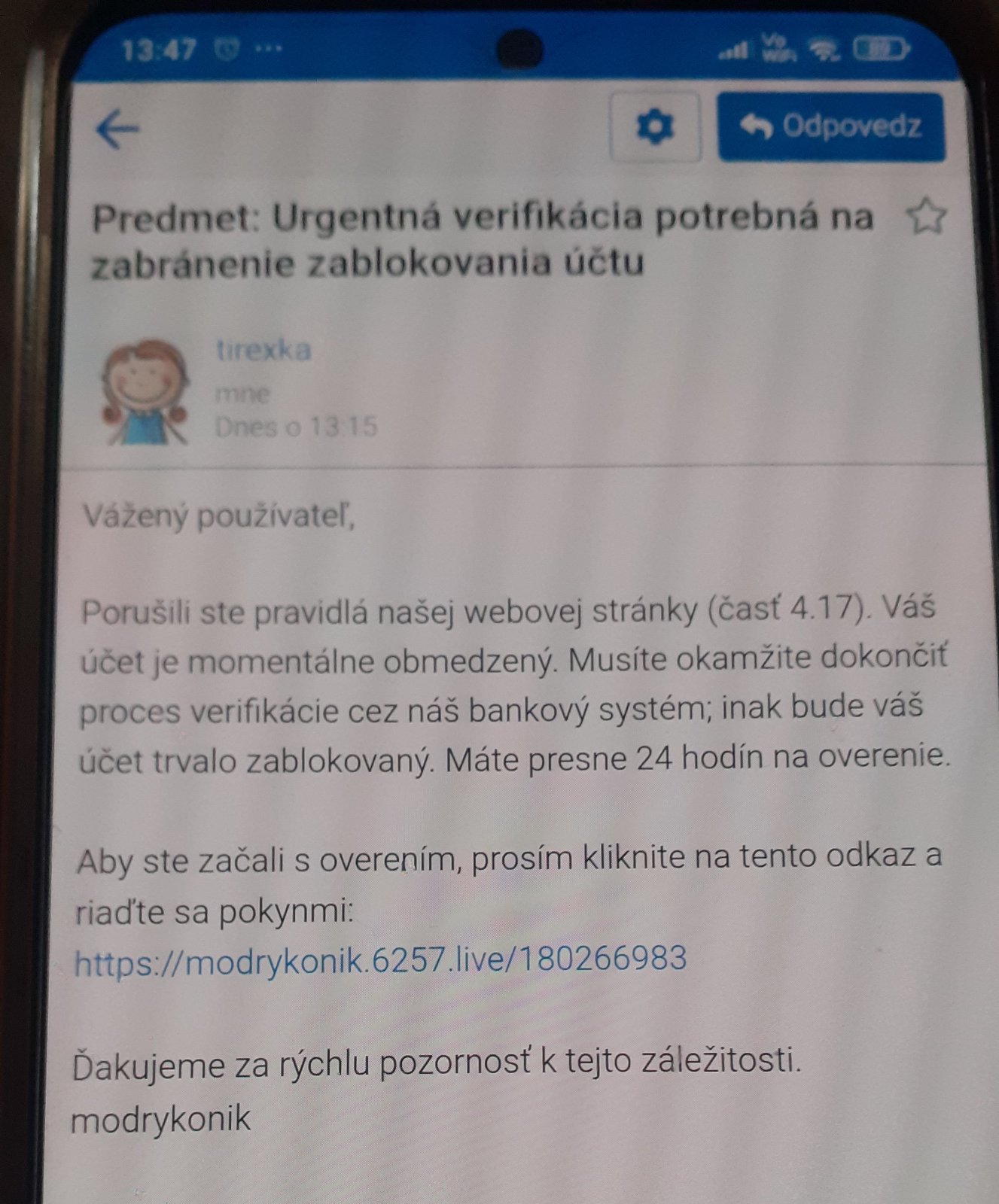 v posledných hodinách ste možno aj vo svojej schránke objavili správu s predmetom „Urgentná verifikácia potrebná na zabránenie zablokovania účtu“, ktorá vyzerá, akoby prišla od Modrého koníka. Ide o podvod.