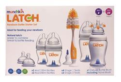 Munchkin LATCH Newborn Starter Set obsahuje: 2 x 4 oz / 120 ml dojčenskej fľaše LATCH ™, 2 x 8 oz / 240 ml dojčenskej fľaše LATCH ™, 4 x západka ™ Stage 1 cumlíkov, 2 x západka ™ Stage 2 cumlíkov, 1 x západka ™ Bottle & prsná bradavka brush.