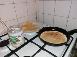 Nepatrím medzi spotrebiteľky bio produktov z obchodu, ale keďže bola možnosť, skúsila som. Testovala som nie ja, ale manžel (u nás robí palacinky len tatík). A poviem vám, vždy sa po nich zaprášilo, ale teraz bolo po nich rýchlosťou svetla. Panvicu sme jemne potreli bio kokosovým olejom. Nie len nevtieravá jemná vôňa v kuchyni ale aj chuť, jednoducho to pridalo palacinkám úžasnú, síce len jemnú, no lahodnú chuť kokosu. Určite odporúčam. Okrem iného som ho pridala aj do bublaniny a opäť nesklamal. Žiaľ kobylky zaútočili a fotka sa nestihla ani urobiť.