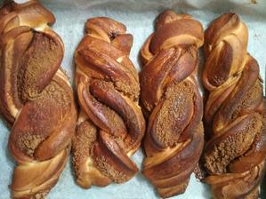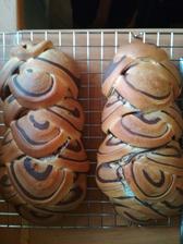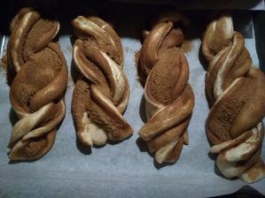 Večer pred pečením si pripravím rozkvas. Zmiešam uvedené prísady múku, vodu, cukor a kvások (vznikne husté cesto, ktoré premiesim rukou). Pri izbovej teplote nechám 9-12 hodín kvasiť. Ráno je rozkvas nakvasený, zväčšil svoj objem a je plný bubliniek. Predtým ako sa pustím do prípravy cesta, pripravím si sladké mlieko a to tak, že v rajnici ohrejem mlieko a rozpustím v ňom cukor, maslo a nechám schladiť. Vlažné sladké mlieko pridám do rozkvasu spolu s ostatnými prísadami. Vypracujem jemne od nádoby sa odlepujúce cesto. Misku prikryjem a nechám pri izbovej teplote kvasiť približne 2 hodiny. Počas týchto dvoch hodín cesto aspoň raz preložím. Po dvoch hodinách je cesto nakvasené, jemné a má znásobený objem. Cesto prehnetiem a rozdelím na 4 rovnaké častí. V miske si zamiešam škoricu s cukrom a trocha mlieka, masla,alebo medu. Každú časť cesta rozvaľkám a natriem pripravenou škoricovou plnkou. Zrolujem na šulec-závin, ktorý ešte preváľam po doske. Takto pripravený šulec -závin pozdĺžne rozrežem a zapletiem. Ak si chcete pozrieť ako na to, podrobné video je tu. Premiestnim na plech vystlaný papierom na pečenie. Prikryjem fóliou a nechám pri izbovej teplote kvasiť približne 3-4 hodiny, kým cesto znásobí svoj objem. Rúru si rozohrejem na 230 stupňov. Ak už mám pletenec nakvasený vložím ho do vyhriatej rúry a pečiem približne 7 minút. Následne teplotu znížim na 170 a nechám piecť približne 20-30 minút. Treba si to odsledovať podľa svojej rúry. No a to je všetko, takto si ľahko pripravíte či už škoricové, alebo kakaové hniezda, ktoré môžu mať podobu či už pletenca alebo hniezda. Nezabudnite piecť, zdieľať a komentovať. Rada sa totižto posúvam ďalej a ak mi dáte spätnú väzbu budem vedieť, či sa vám recept páči a ako sa vám darí ho upiecť 🙂