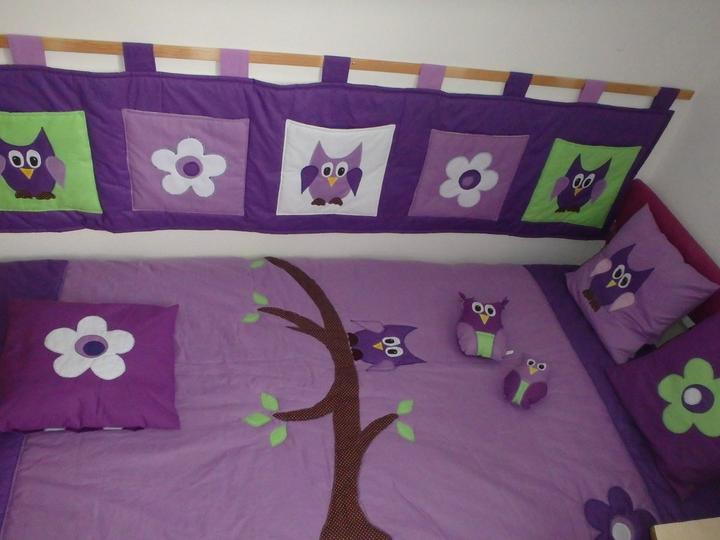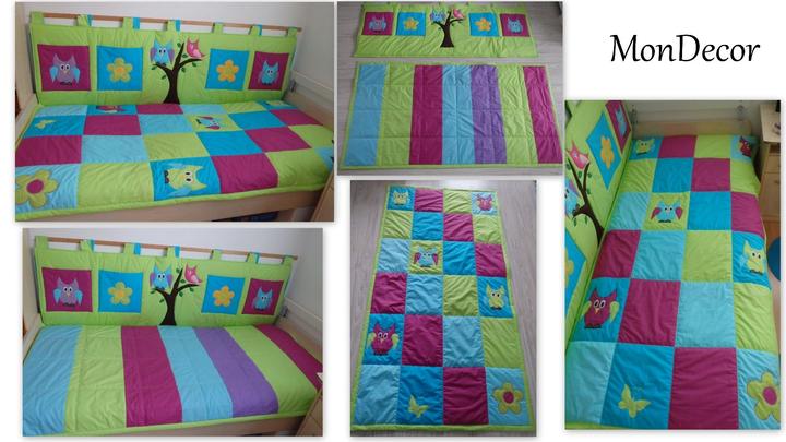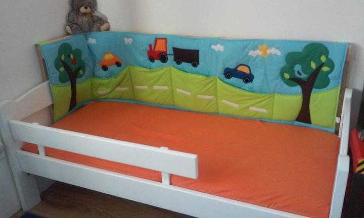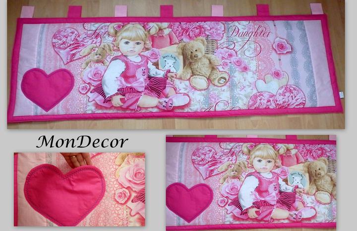 Zástena slúži na ukladanie drobností a zároveň ochráni vaše dieťa od studenej steny. Je šitá zo 100% bavlny, plnená 200g vatelínom, vreckár má ušité aj vrecká na odkladanie drobností, zástena vrecká našité nemá. Aplikácie sú strojovo našívané, niečo je aj maľované fixou – farbou na textil. Pranie je vhodné na 30 st, žehlenie na strednú teplotu. V prípade akýchkoľvek otázok ma neváhajte kontaktovať, spolu už niečo vymyslíme. Ak nemáte presnú predstavu o vašej budúcej izbe, rada vám poradím, vymyslíme, doladíme všetko tak, aby spokojné bolo predovšetkým vaše dieťa.