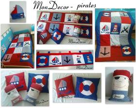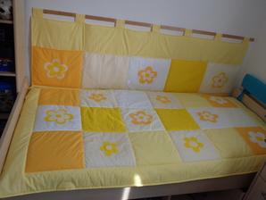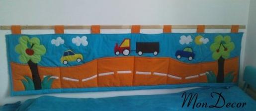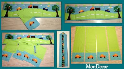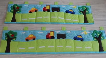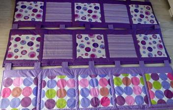 Zástena-vreckár slúži na ukladanie drobností a zároveň ochráni vaše dieťa od studenej steny. Je šitá zo 100% bavlny, plnená 200g vatelínom, vreckár má ušité aj vrecká na odkladanie drobností, zástena vrecká našité nemá. Aplikácie sú strojovo našívané, niečo je aj maľované fixou - farbou na textil. Pranie je vhodné na 30 st, žehlenie na strednú teplotu. V prípade akýchkoľvek otázok ma neváhajte kontaktovať, spolu už niečo vymyslíme. Ak nemáte presnú predstavu o vašej budúcej izbe, rada vám poradím, vymyslíme, doladíme všetko tak, aby spokojné bolo predovšetkým vaše dieťa.
