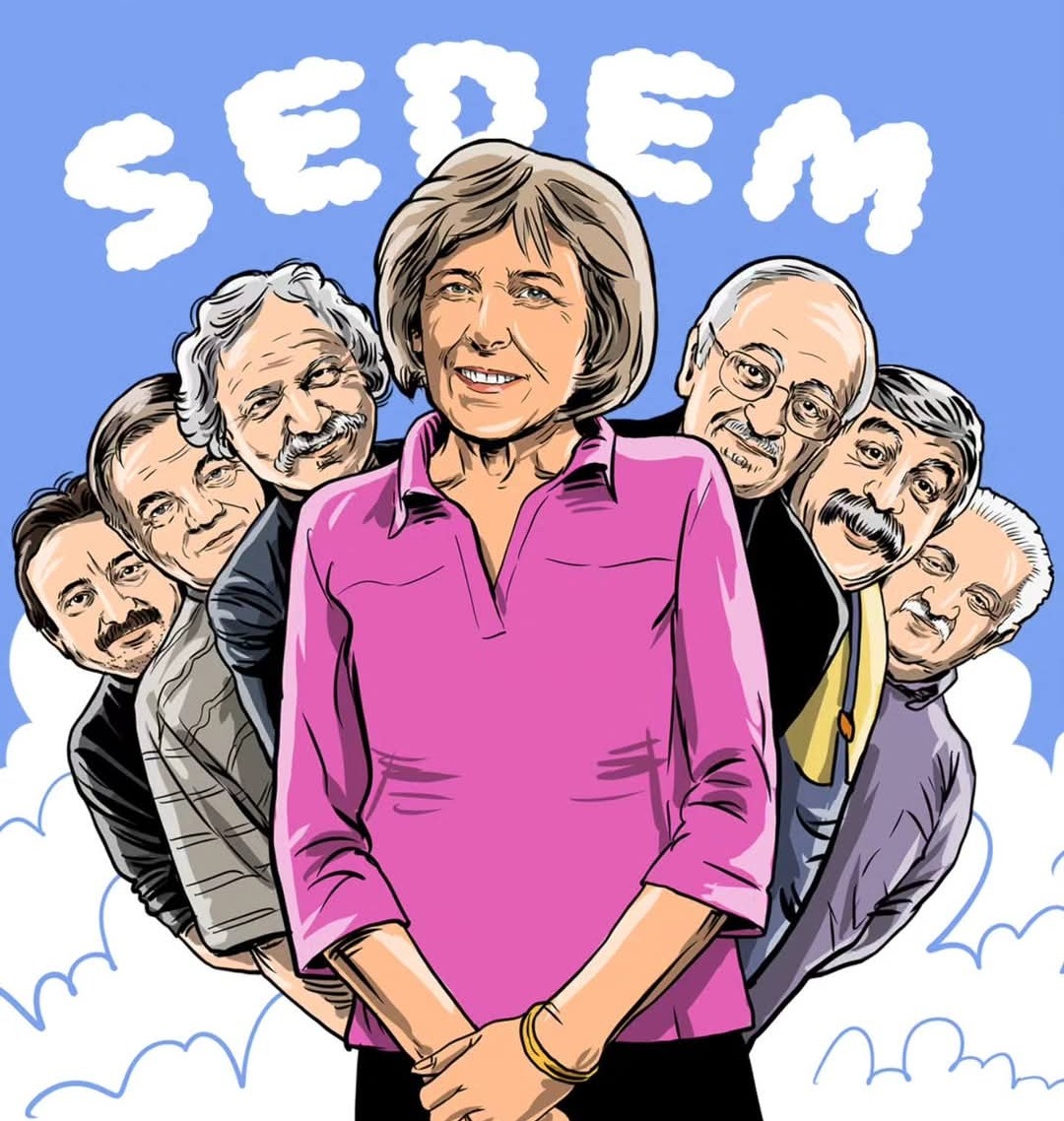 Je to karikatúra, takže podoba nemusí byť stopercentne presná, ale kontext relácie "Sedem" a zjavná podobnosť s Magdou Vášáryovou a glosátormi poukazuje na túto skupinu.
