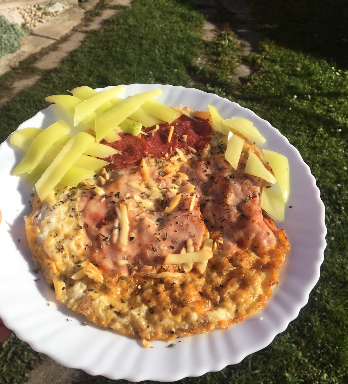Potrebujeme : kokosový olej, 100g postrúhaný syr, šunka, vajíčka, korenie, soľ, bazalka, zelenina