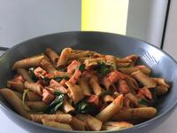 Hrachove penne (gluten free bez vajičok)Paradajkova omačkaCerstvy spenatSojova salamka (sojovy narez z tesca/kauflandu)Bylinky, soľRepkovy olej
