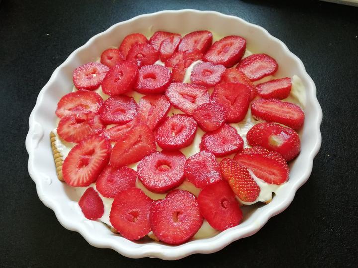 Jahodová mňamka :strawberry: :strawberry: :strawberry: Maslové sušienky, 2ks kysla smotana 16% vyslahanes van. Cukrom a na vrchu:strawberry::strawberry::strawberry: