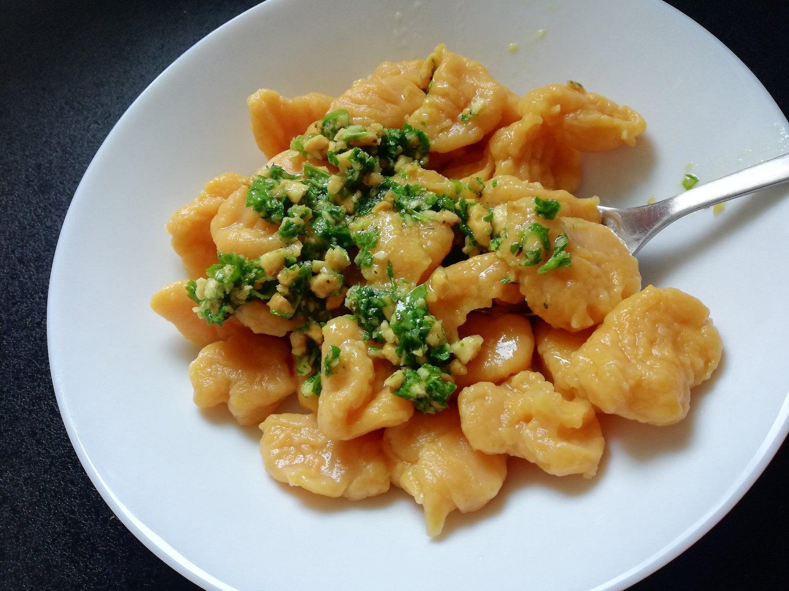 Batatové gnocchi s pestom 500g batat Adi 200g muka mozno aj viac mne sa to lepilo Sol 1vajce Pesto Pražené mandle, špenát, rukola, cesnak, sol, olivový olej