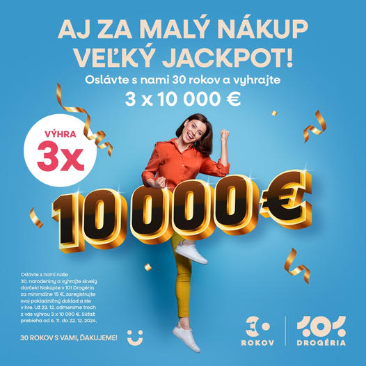 Pri príležitosti okrúhleho jubilea si 101 Drogéria pripravila oslavu ako sa patrí. Aj za malý nákup môžete získať veľký jackpot a to hneď trikrát 10 000 eur. A to je veľmi príjemná suma. Už si predstavujem ako ju míňam 🙂. Rýchlo a zbesilo!