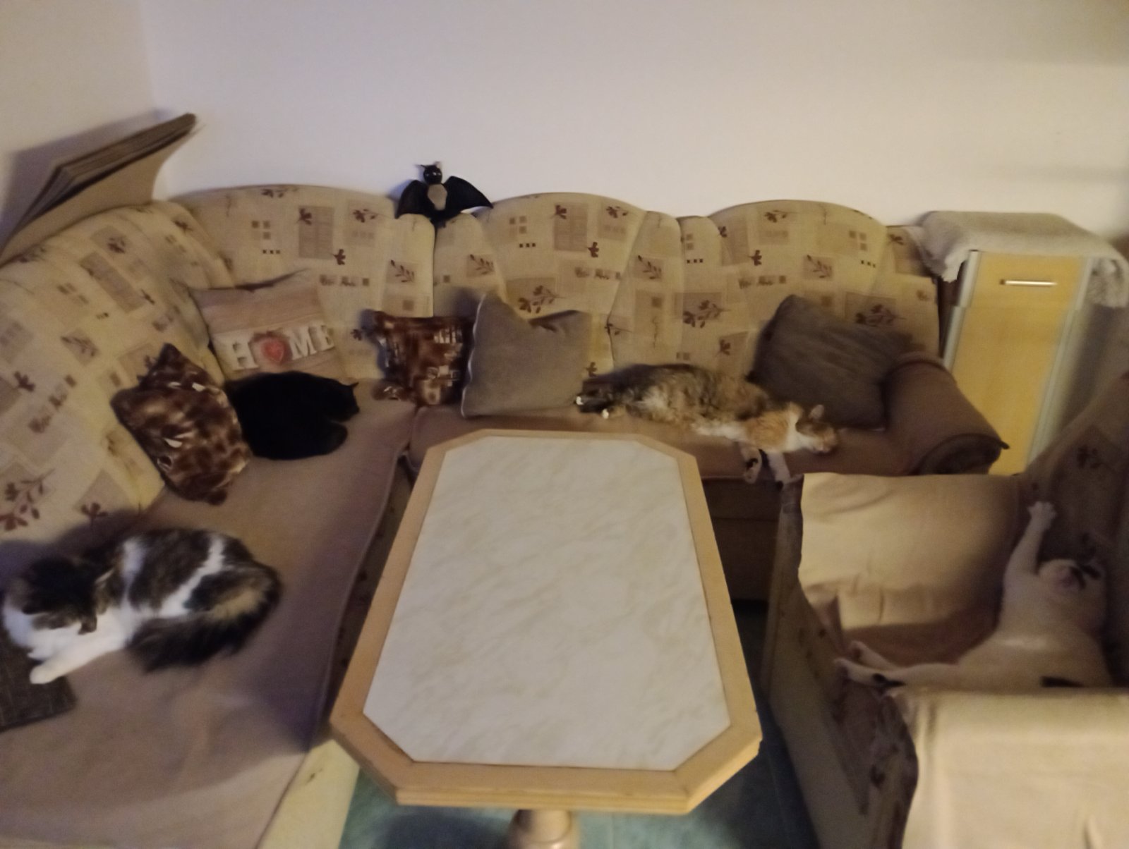 My máme mačiek veľa,ale v útorné iba 2.Za dámu je Froda a dedinský najdúch Karoľ .Čierna je mačka,sivý kocúr,ten má zajtra termín u vet.,kde príde o mačacie mužstvo.Držte mu palec