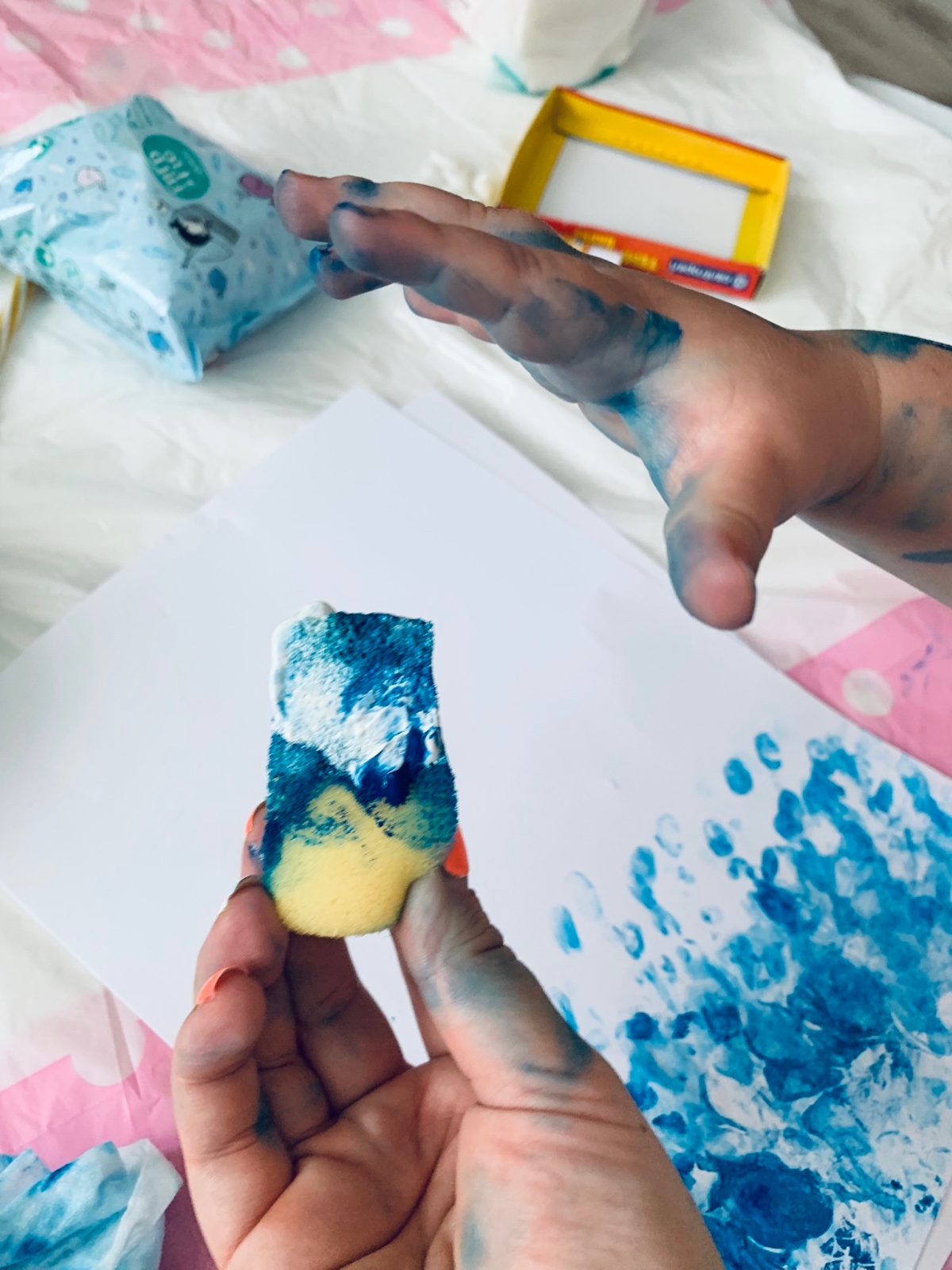Potom si pripravíme kúsok špongie na ktorý natrieme modrú a bielu farbu. Tou dieťa zvládne bez problémov jemne otláčať špongiu na hornú časť papiera kde nám vznikne nebo a oblaky.