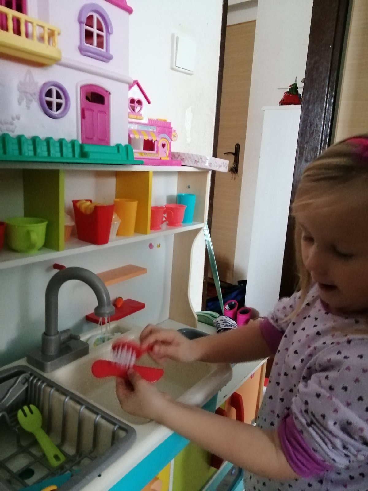 Eliška pochopila ze keď bude voda mimo drez tak koncime😂neviem koľko má vaša, nasa ma už 3,5 takže s nou sa už dá dohodnúť.