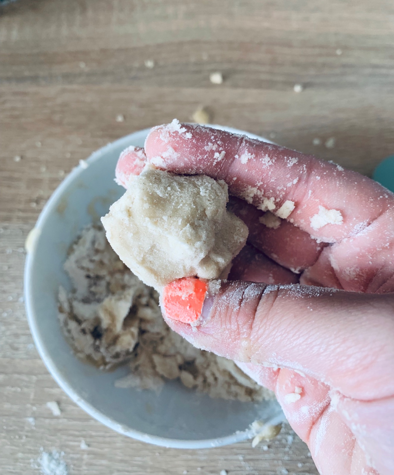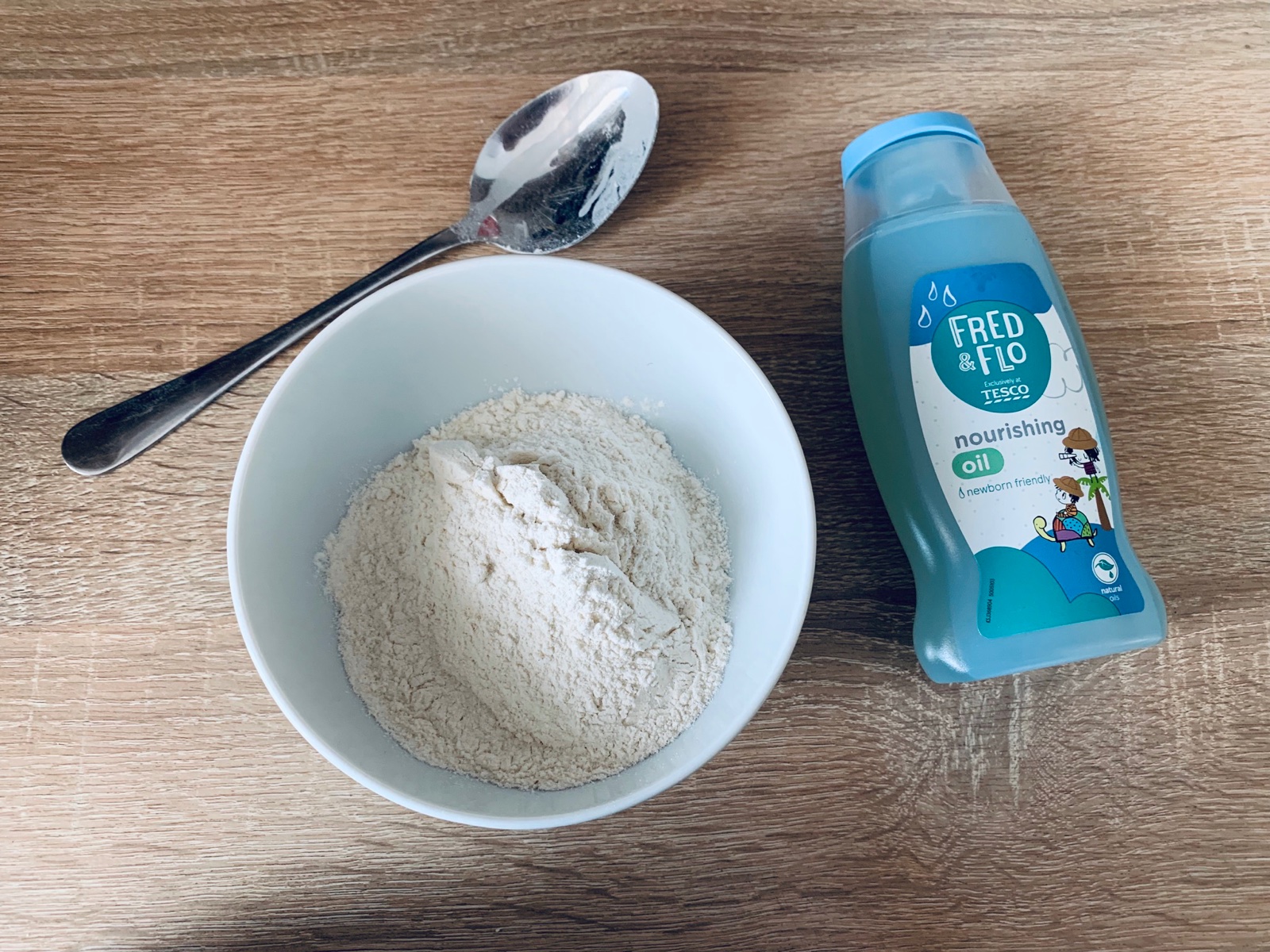 Potrebujete len hladkú múku a detský olej. Tieto dve suroviny primiešam do konzistencie mokrého piesku. Vytvorí sa nám piesok, z ktorého si deti môžu tvarovať guličky alebo robiť koláčiky do formičiek. 😊