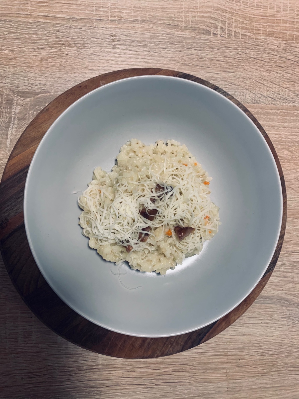 Medzitým si na panvici osmažime do sklovita druhu časť cibuľky, pridáme ryžu, ktorú trocha osmahneme a zalejeme asi 5 cm nad jej okraj cuketovou ,,polievkou”. Takto prilievane až pokiaľ nie je ryža mäkká podľa toho ako obľubujeme. Dochutime soľou, korením a do horúceho odstaveného rizota pridáme plátky klasického masla, ktoré nám úplne zjemnia chuť.