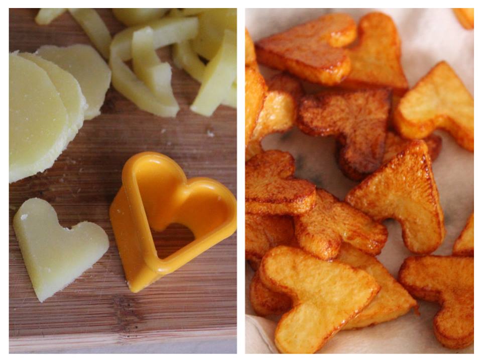 nachvíľu som dala variť zemiaky, a potom ich pokrájala na plátky a z nich vykrajovala 🙂 zemiaky nesmú byť moc uvarené aby sa nelámali...potom som ich upiekla 🙂