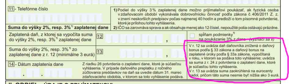 na tom Vyhlásení to máš presne napísané - do riadku 12 dávaš sumu z Potvrdenia z r. 24 a na r. 13 vypočítaš z toho 2 percentá (zaokrúhľuješ nadol na dve desatinné miesta)