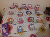 Syn odnesie drevene skladacky a lizatko. Ucitelkam kavu a cokoladu/ovocie v cokolade