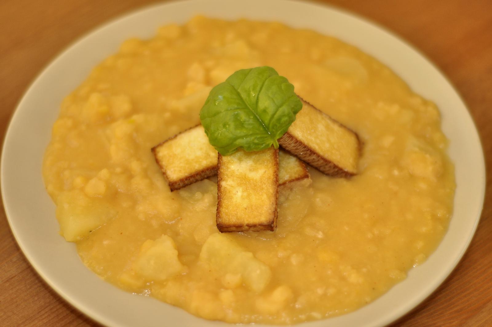 Hrachová kaša s opečeným údeným tofu