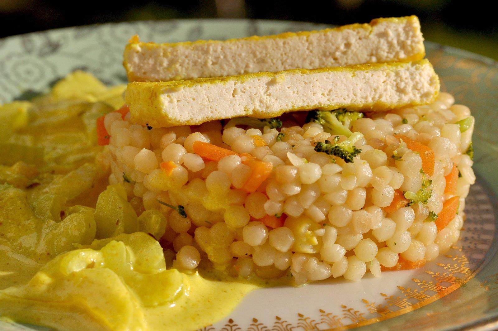 Kurkumové tofu so zeleninovou tarhoňou a karí zelerovou omáčkou