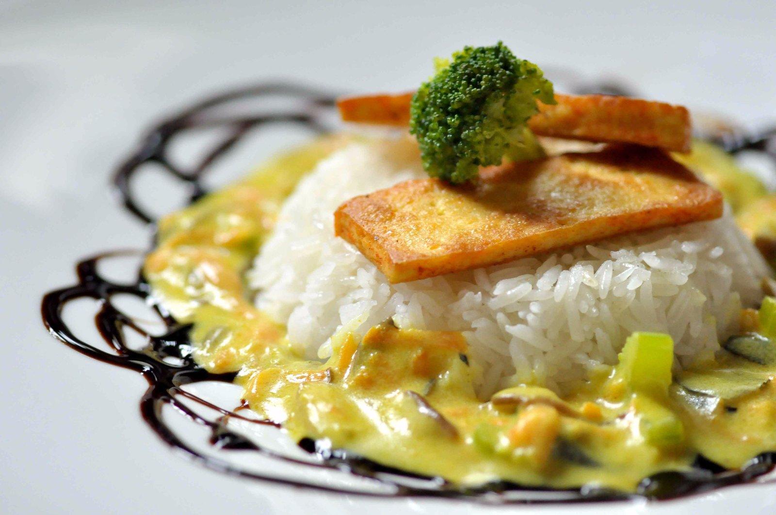 Tofu s karí-zázvorovo-hríbovo-zeleninovou omáčkou a jazmínovou ryžou