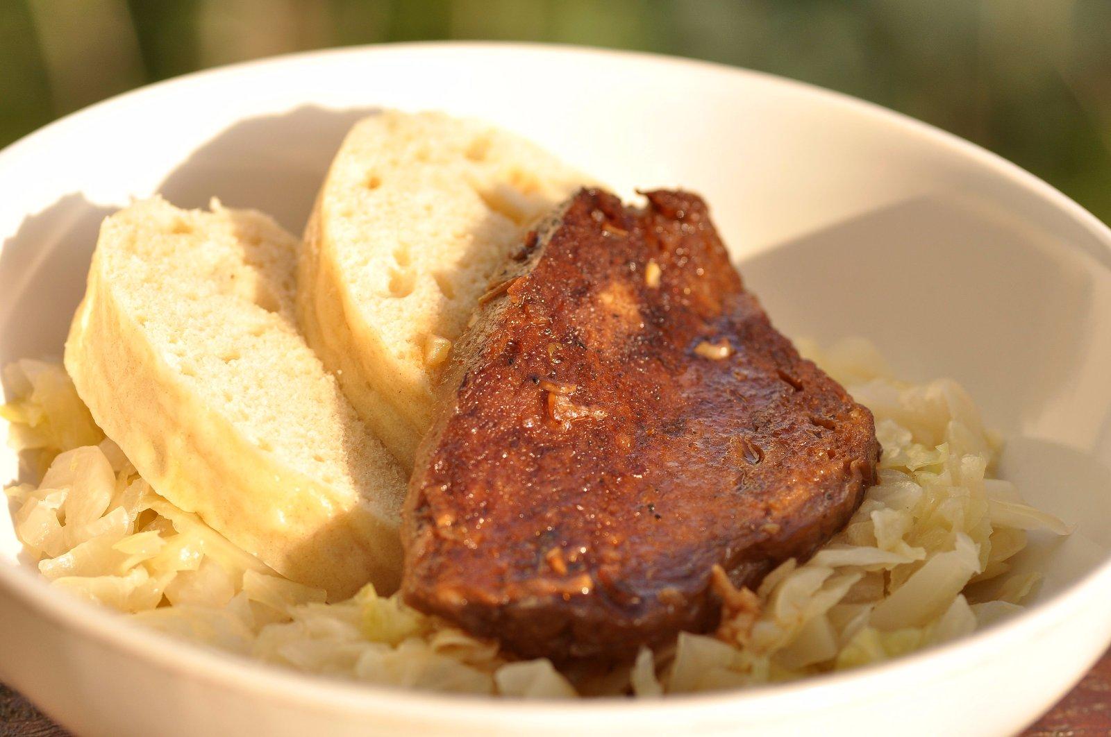 Seitan s dusenou kapustou a vegánskou špaldovou knedľou