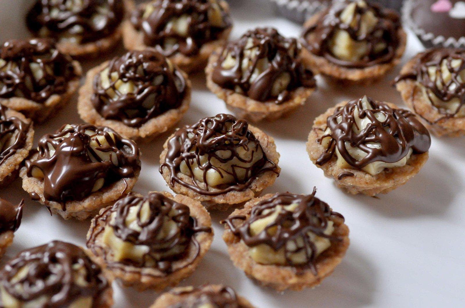 Vegánske orechové košíčky plnené vanilkovým krémom obliate čokoládou