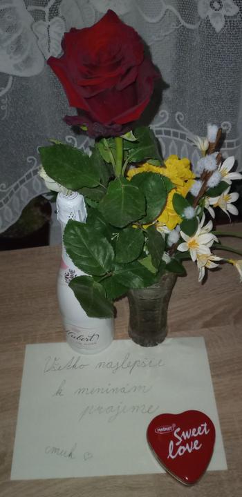 Volá mi o 15:00 ..že ako sa máme doma ( som s chorým synčekom doma) vravím všetko v poriadku láska,prehodili sme pár slov a vravím no veď onedlho ste doma (cca 40min.) A zo srandy som mu trepla do telefónu že "už len prídte, kľudne aj s kyticou ruží a fľašou šampusu" a...prišiel s krásnou ružou a tým čo mám rada❤️🥂🌹