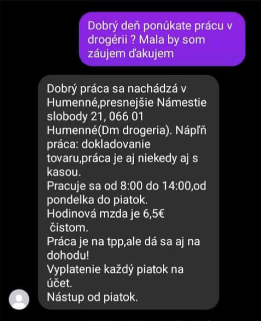 "dm drogerie markt Slovensko nezverejňuje ponuky práce prostredníctvom facebook skupín, ani nekontaktuje záujemcov o prácu prostredníctvom messengera. Aktuálne ponuky práce nájdete na stránke dm-jobs.sk. Záujemca o prácu je kontaktovaný prostredníctvom e-mailu, ktorý zadá vo formulári zverejnenom pre danú pozíciu. Na iné výzvy, prosíme, nereagujte."