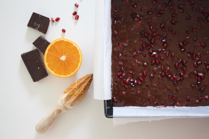 Začala som zľahka - pomarančovým brownies s granátovým jablkom. Táto kombinácia mi napadla včera večer, tak som sama zvedavá, ako to dopadne a či nám bude chutiť 😉